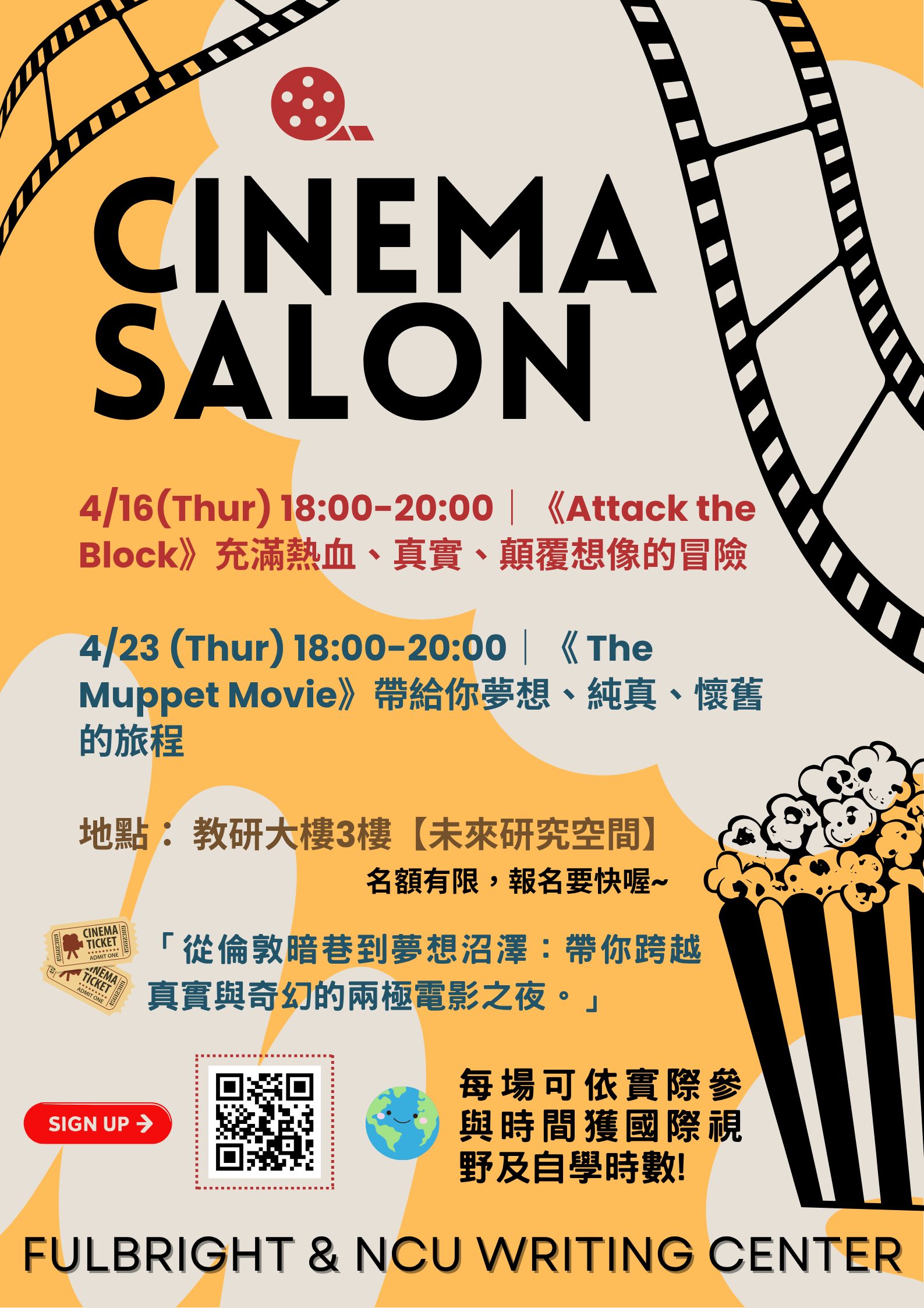 想在校園裡享受銀幕魅力嗎?Writing Center 誠摯邀請你參加 Cinema Salon 電影沙龍,一起來看電影、聊英文!